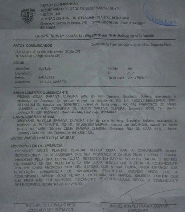 um boletim de ocorrência registrado no Plantão Central da Beira-Mar (Reffsa),
