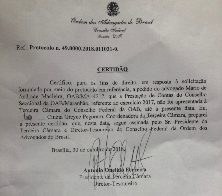 A informação é de que o candidato se encontra inelegível por não ter prestado contas da sua gestão referente ao exercício financeiro do ano de 2017 à Terceira Câmara do Conselho Federal da OAB.