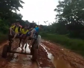 alunos se arriscam sentados ao fundo do veiculo de tração animal,