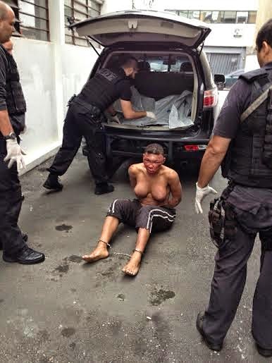 superior da orelha direita e o preso detido por policiais próximo da viatura.
