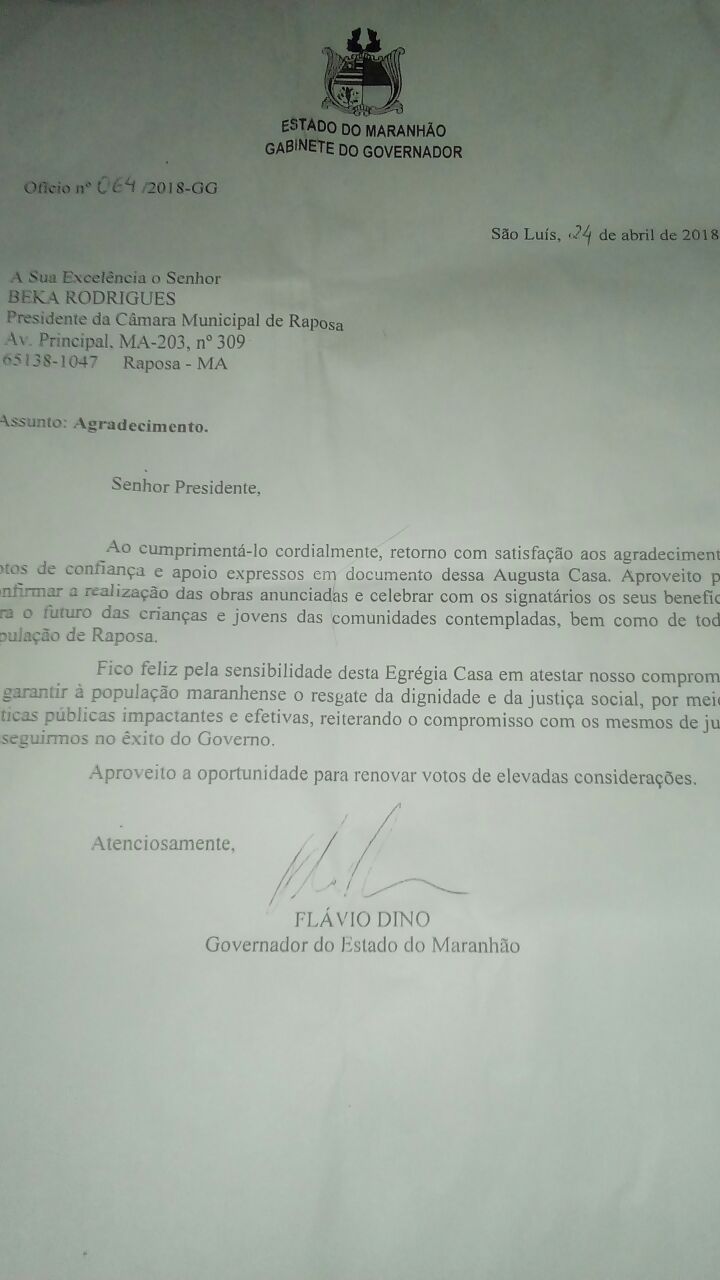 Abaixo a carta enviada pelo Governador á Câmara Municipal de Raposa.