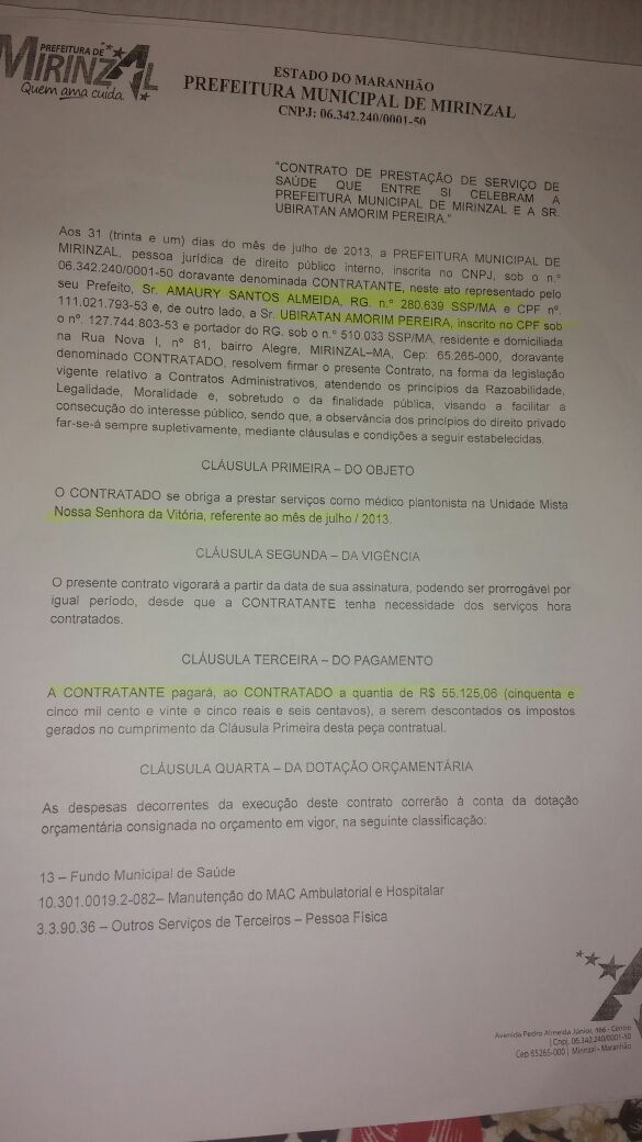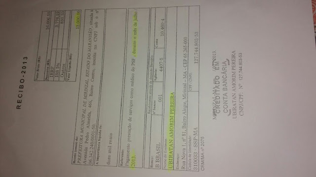 O Caso do médico Ubiratan Amorim Ferreira foi outro que chamou bastante atenção. Para exercer suas funções no chamado Programa Saúde da Família, em um único mês, o médico recebia a bagatela de R$57.000,00(cinquenta e sete mil) reais. O detalhe é que na cidade, de acordo com alguns moradores, o médico até prestava serviço, mas não pelo programa federal do PSF.