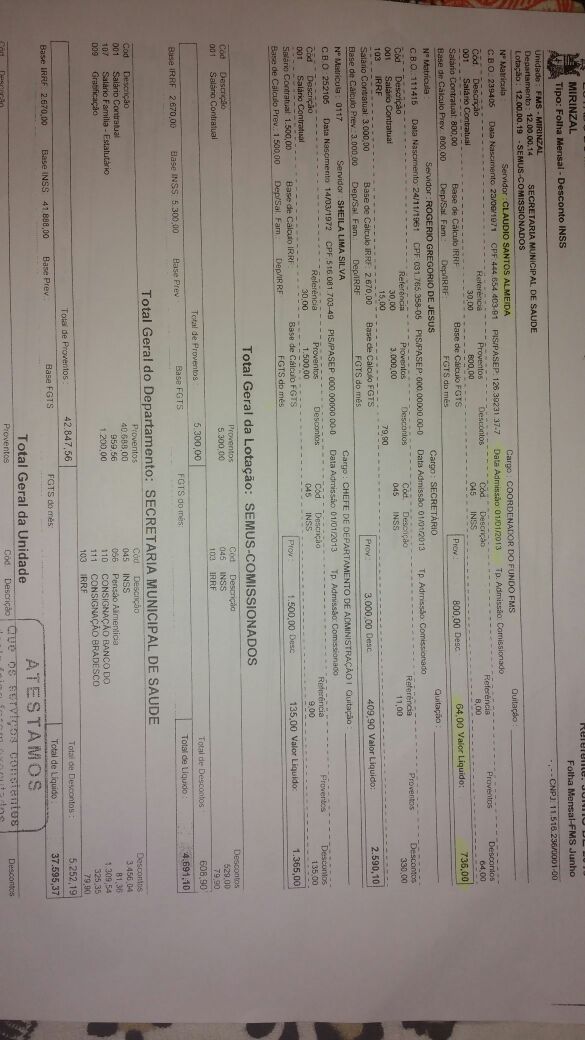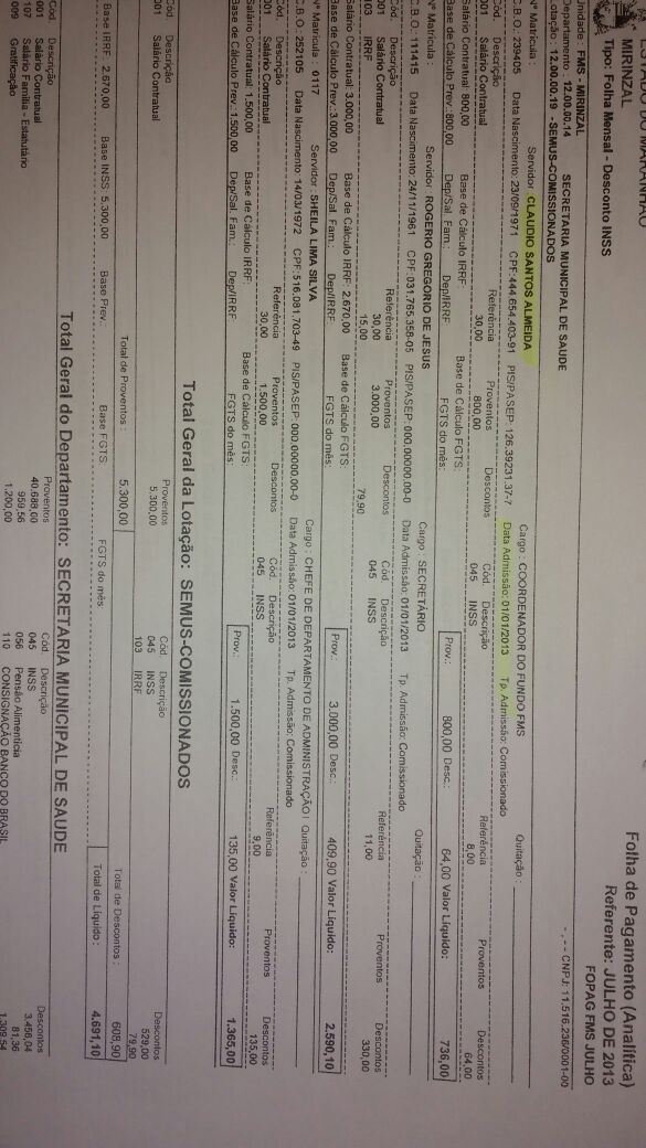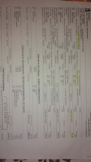 Segundo documentos analisados, no ano de 2013, por exemplo, Cláudio Almeida recebia a quantia de R$3.000,00(três mil) como secretário e, ainda, R$800,00(oitocentos reais) como coordenador do fundo municipal de saúde.