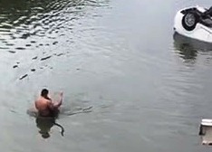 retirou a motorista da água. Ele abre a porta do carro e a carrega com vida até