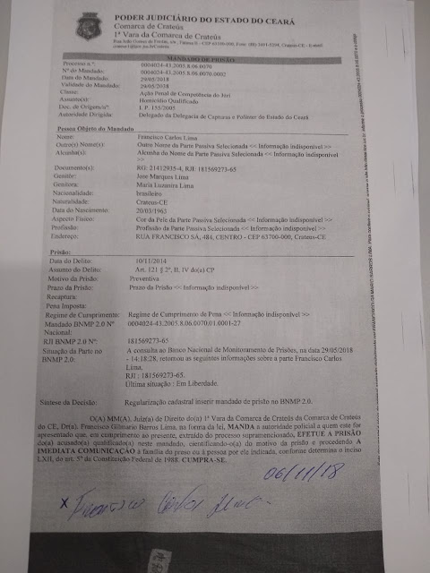 A Polícia Civil através da Delegacia Regional de Caxias efetuou na tarde desta terça-feira(6), a prisão de Francisco Carlos Lima de 52 anos, conhecido por “Amaro”, em cumprimento ao mandado de prisão preventiva expedido pela Comarca de Crateús CE, que de acordo com o Delegado Regional, o mesmo teria cometido homicídio qualificado no ano de 2005. Amaro estava residindo em Caxias há mais de 12 anos, onde possui um comércio.