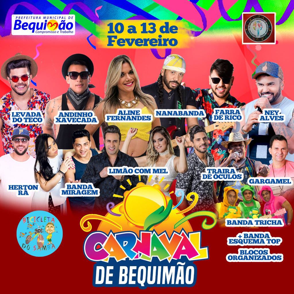 Saiu nesta semana a lista das 14 atrações que farão a alegria de milhares de foliões na cidade de Bequimão no Carnaval 2018. Serão 4 dias de muita folia, começando no sábado dia 10 e encerrando na terça-feira, dia 13 de fevereiro. Além disso a cidade vai receber as escolas de samba e os blocos tradicionais e alternativos que arrastão multidões pelas ruas da cidade. Na praça 2 de novembro, serão uma média de 4 bandas por noite, e o que não vai faltar é muito disposição do folião para pular os 4 dias de folia momesca.