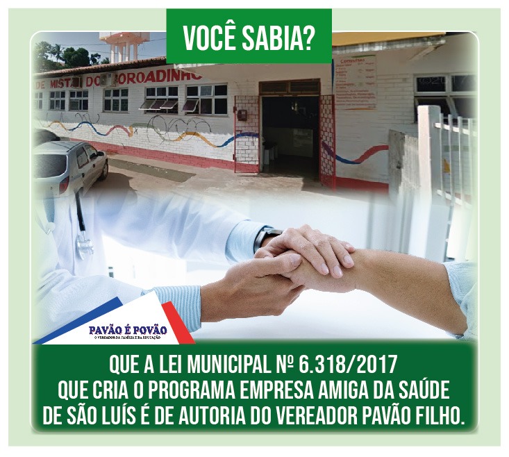 Você Sabia? ! Que a LEI MUNICIPAL Nº 6.318/2017 que Cria o Programa EMPRESA AMIGA DA SAÚDE DE SÃO LUÍS é de autoria do Vereador Pavão Filho.
