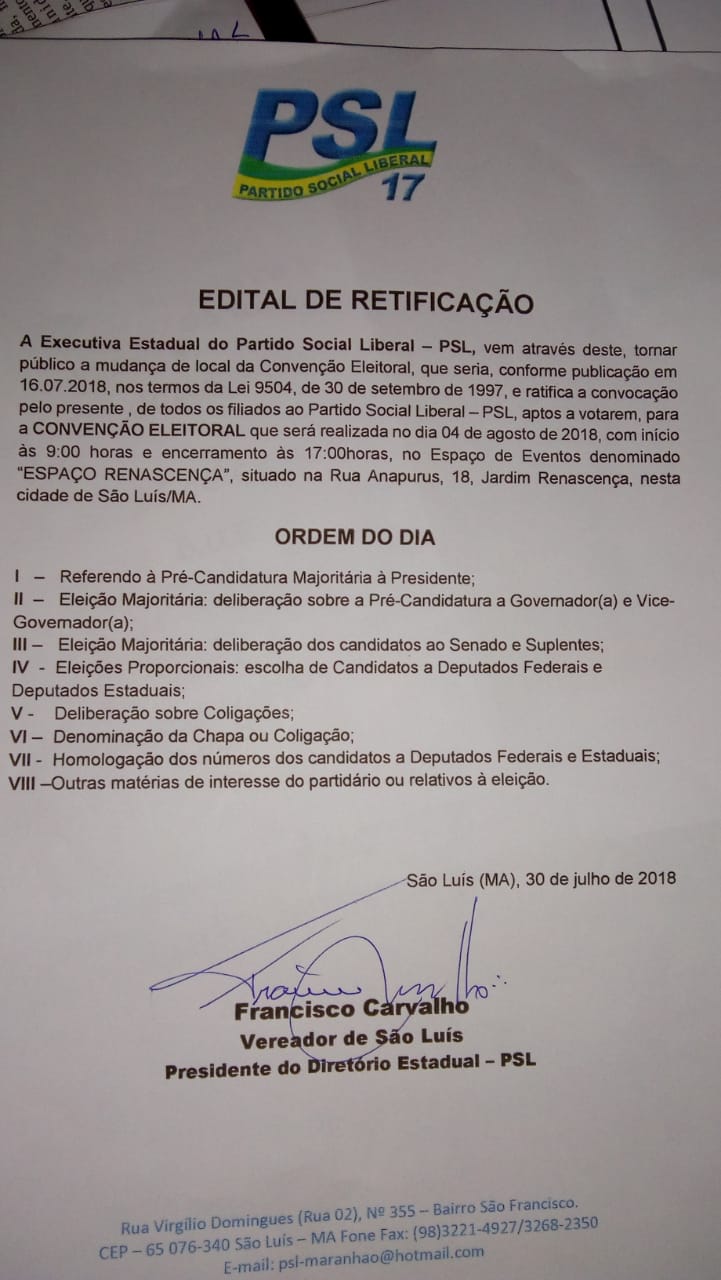Socialista Liberal –PSL, Chico Carvalho confirmou que a convenção partidária será realizada no sábado dia 4 de agosto, o