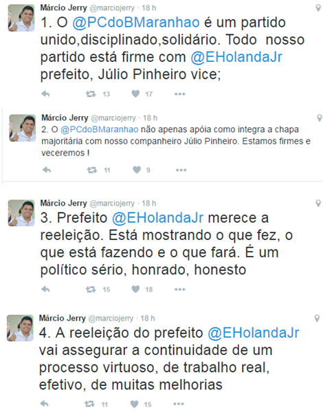 O deputado federal Rubens Pereira Júnior (PCdoB) usou a rede social do twitter para fazer uma, digamos, ironia sobre a notícia dada pelo blog do colega Diego Emir, de que o comunista teria assumido a coordenação da campanha do candidato a prefeito de São Luis, Eduardo Braide (PMN).