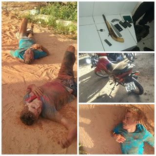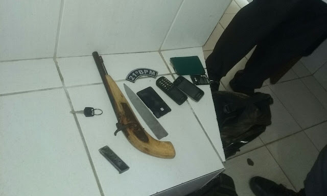 Com eles a policia encontrou, 2 celulares , 1 arma caseira , 1 carregador de 6.35 com 3 munições intactas , 1 faca,  2 mochilas contendo roupa e documentos pessoais . 1 motocicleta Fan 125 Vermelha . Placa: psb 6879 Rouba