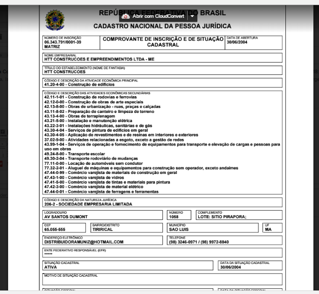 Conforme dados extraídos da Receita Federal, a HTT tem o montante de R$400 mil em capital integralizado. Inscrita no Cadastro de Pessoa Jurídica sob o nº 06.343.791/39, a empresa tem como sede um imóvel, praticamente abandonado, como a própria foto evidencia, situado na Avenida Santos Dumont, nº1052 – no São Cristóvão, na capital maranhense.