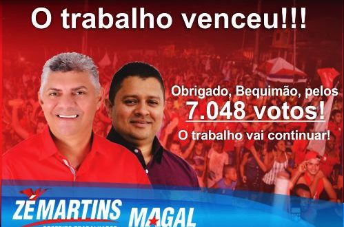 Se o slogan de campanha de Zé Martins dizia que o “Trabalho tem que continuar”, a população de Bequimão logo entendeu e mostrou nas urnas que o município tem um gestor de verdade. Aprovado por 51% do eleitorado bequimãoense, Zé Martins (PMDB) entrou para a história por ser o segundo prefeito reeleito em Bequimão.